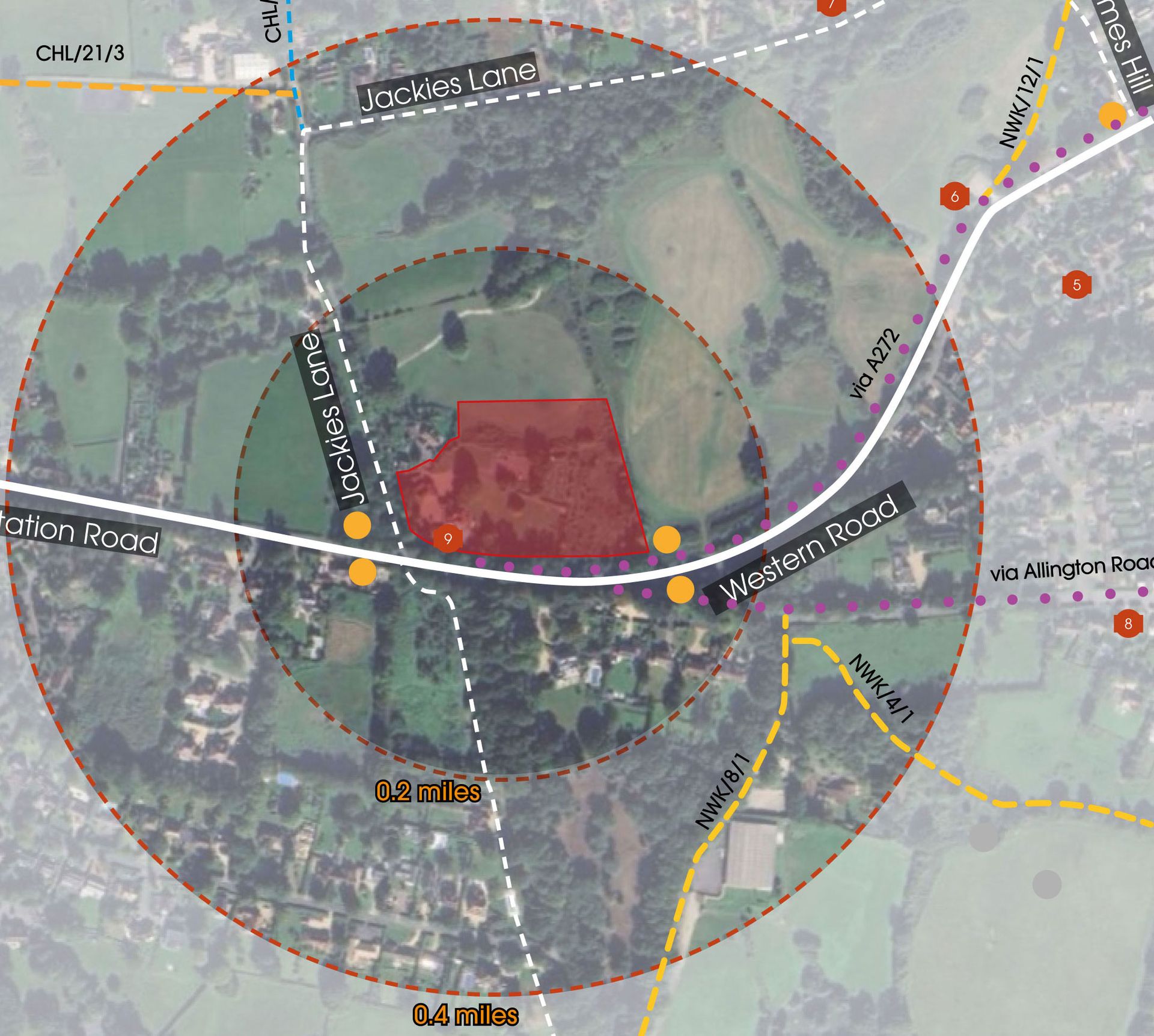 - Pedestrian access will be provided in the southeast and southwest corners of the site, leading to new pedestrian crossings on Jackies Lane and Western Road (A272).